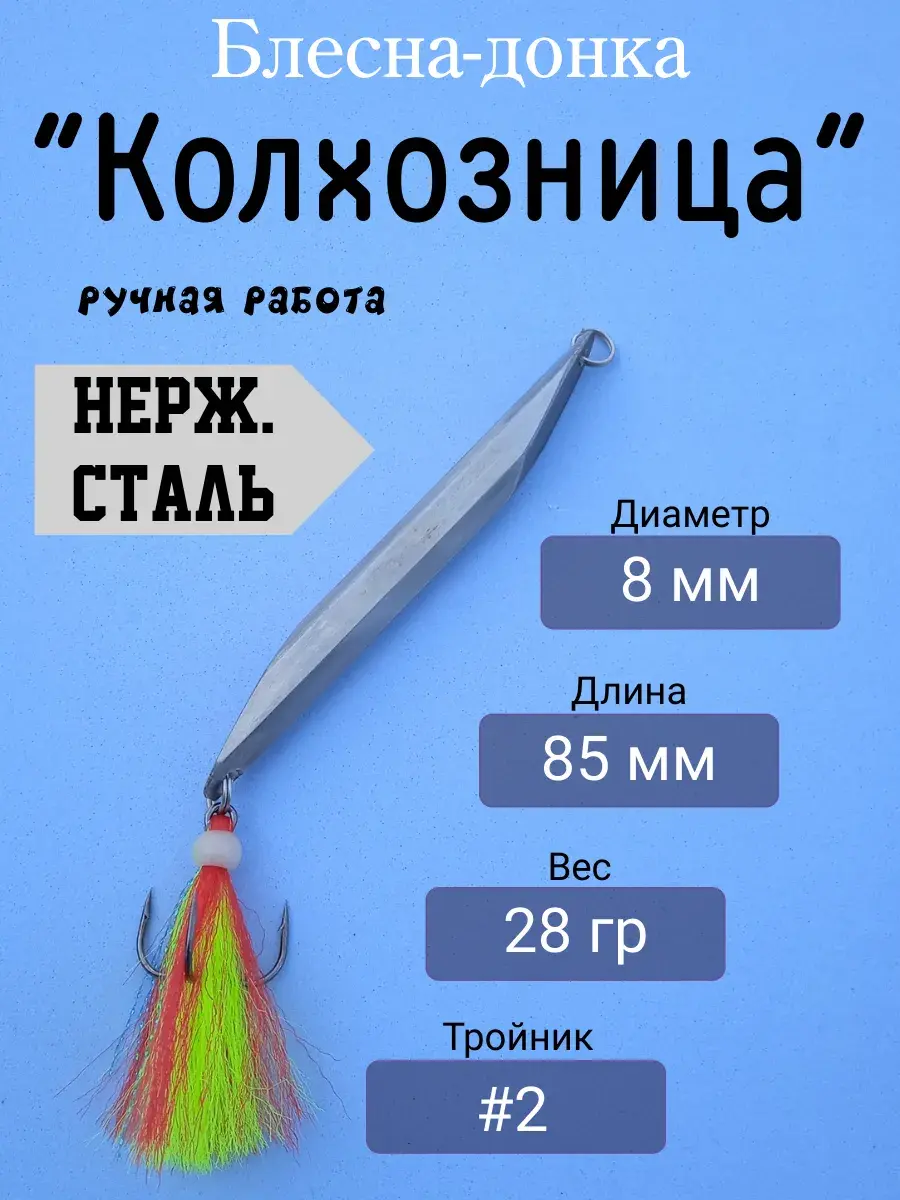 Донная блесна "Колхозница" - испытанная и проверенная годами приманка для ловли хищных рыб - судака, щуки, сома и т.д. методом отвесного блеснения. Материал блесны - нержавеющая сталь марки Aisi 304. Скошенные торцевые поверхности дают неповторимую хаотичную игру при проводке что вкупе с ярким и пушистым хвостом неминуемо провоцируют хищника на атаку. Хвостовой оперение крепится светонакопительной силиконовой бусиной, яркое свечение которой дополнительно прибавляет заметности в толще воды.