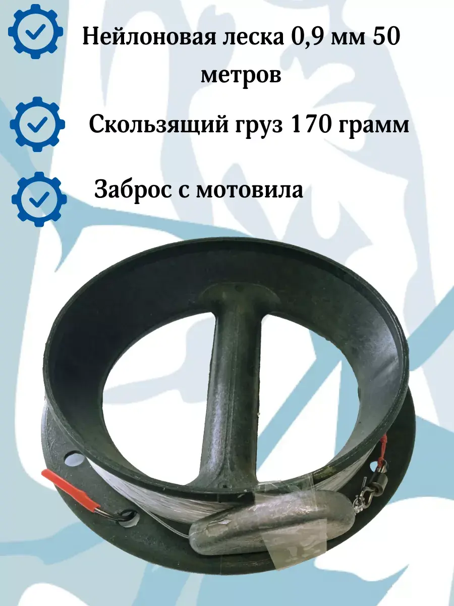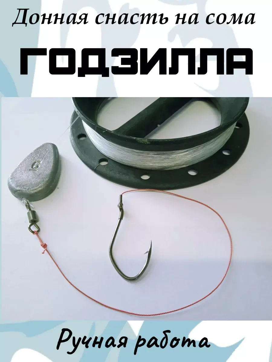 Донная снасть "Годзилла" - готовый монтаж для ловли сома заброс. Включает в себя 50 метров качественной лески диаметром 0,9 мм, скользящее грузило весом 170 грамм, корейский крючок характерной формы размером 4/0 на кевларовом поводке. Круглое мотовило позволяет забрасывать снасть без полного разматывания лески.