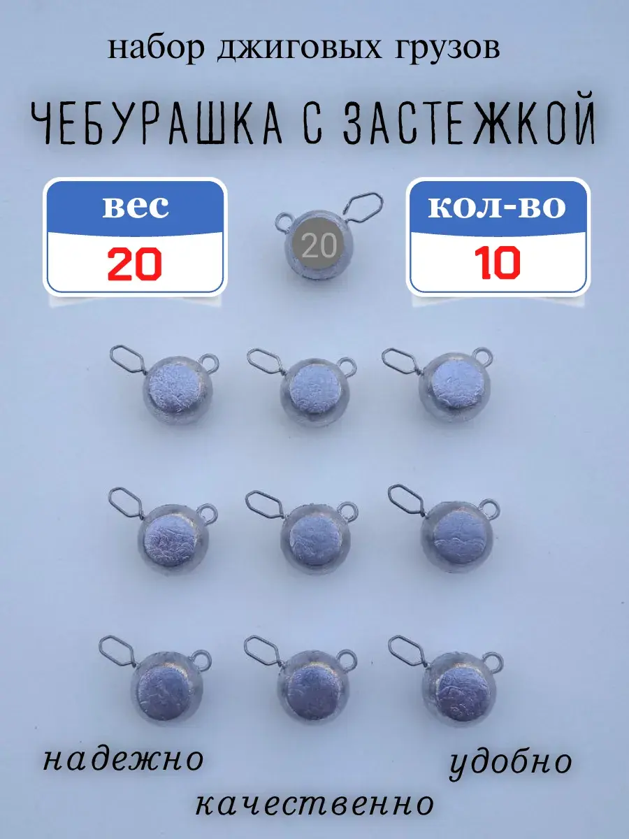 Грузило "Чебурашка с застежкой" используется для оснащения силиконовых и иных приманок, мандул, стримеров при ловле на джиг. Оснащение грузика застежкой добавляет удобства при замене груза или приманки. Используется застежка типа "американка", очень надежная , изготовлена из упругой высокоуглеродистой стали. Количество циклов застегивания/растегивания не ограничено. Груз имеет форму шара, сплуснутого с боков. На одной стороне выдавлени вес.