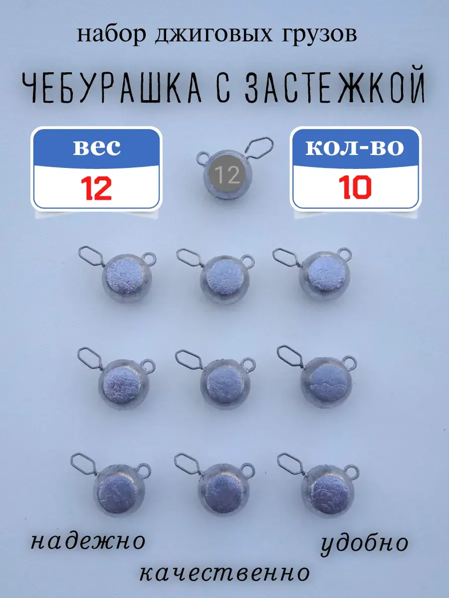 Грузило "Чебурашка с застежкой" используется для оснащения силиконовых и иных приманок, мандул, стримеров при ловле на джиг. Оснащение грузика застежкой добавляет удобства при замене груза или приманки. Используется застежка типа "американка", очень надежная , изготовлена из упругой высокоуглеродистой стали. Количество циклов застегивания/растегивания не ограничено. Груз имеет форму шара, сплуснутого с боков. На одной стороне выдавлени вес.