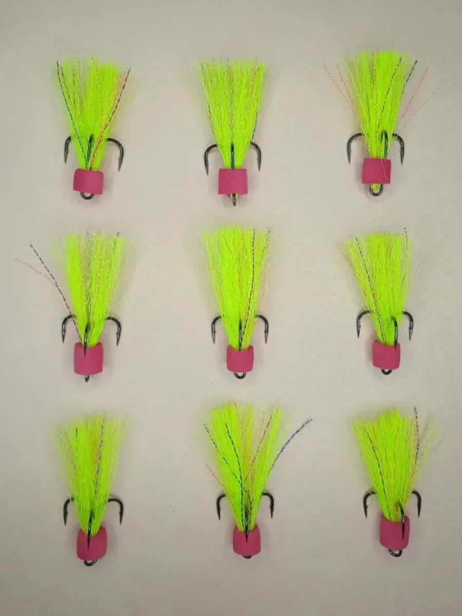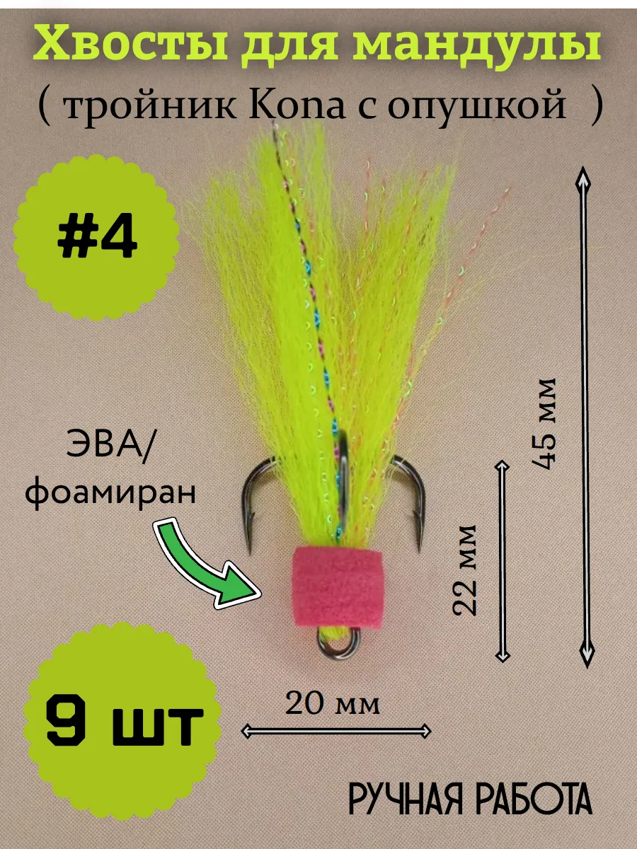 Хвост для мандулы представляет собой высококачественный тройник Kona с опушкой из канекалона и люрекса, зафиксированных на цевье цилиндром из ЭВА. Материал ЭВА придает большую плавучесть тройнику, что хорошо соответствует общей плавучести мандулы. В набор входит 9 хвостов салатового цвета.
