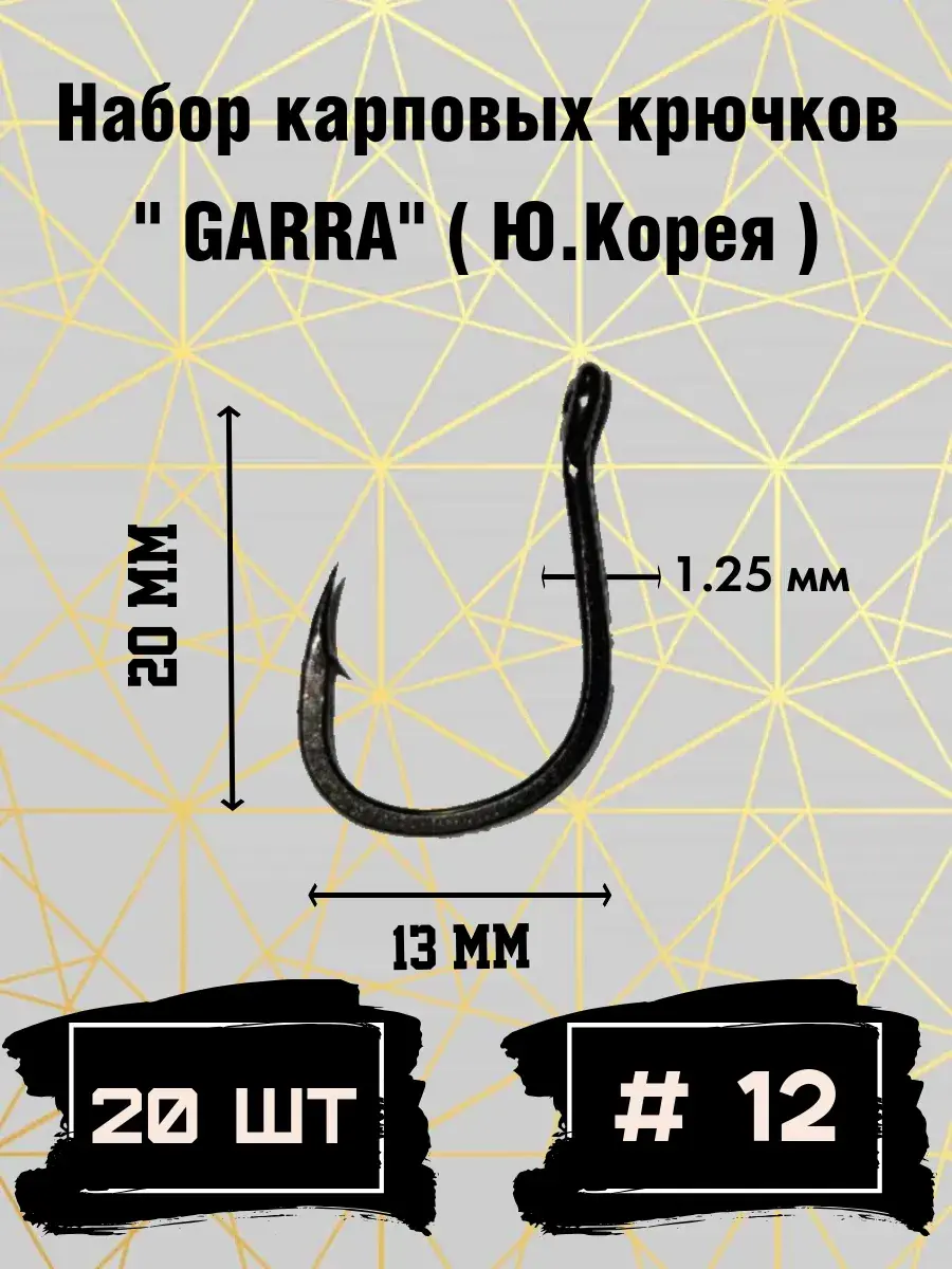 Карповый крючок " GARRA " #12 - классический крючок для ловли сазана. Изготовлен в Южной Корее из высоколегированной стали. Применяется, в основном, для оснащения макушатников, а также при ловле карповых на бойлы. Отличается высокой прочностью и надёжностью. Нижняя часть крючка, весь изгиб, прикован для увеличения жёсткости. При экстремальных нагрузках не ломается, а разгибается. Статическая нагрузка - 10 кг. Покрытие - темный никель. Ушко немного отогнуто назад, острие загнуто внутрь.