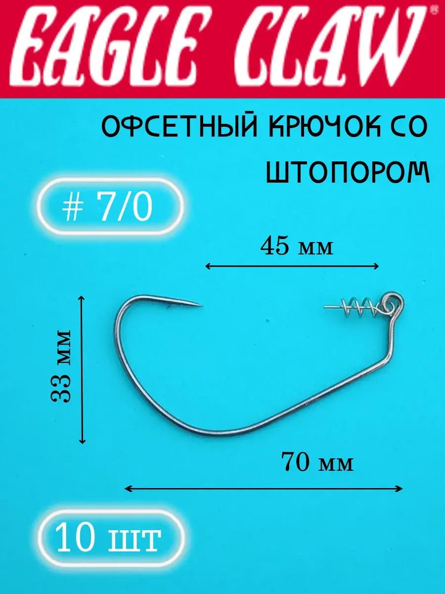 Офсетный крючок со штопором, форма изгиба - Wide Gap Worm. Производство американской фирмы Eagle Claw. Изготовлен из высокоуглеродистой стали с покрытием “Темный никель”, очень прочный и острый, при больших нагрузках пружинит, но не ломается. Наличие штопора ( пружинки ) позволяет очень легко и надежно зафиксировать силиконовую приманку в головной части, что предупреждает ее сползание в процессе ловли. Оригинальная форма офсетного крючка дает возможность просто и быстро насадить приманки любых форм, в том числе широких. Основное применение офсетных крючков – монтаж приманки в незацепляющемся варианте для джиговой проводки, для оснасток “Каролина”, “Техас”, “Московская” и др. Жало крючка смотрит точно на ушко с пружинкой, что делает монтаж- “Незацепляйку” идеальной.