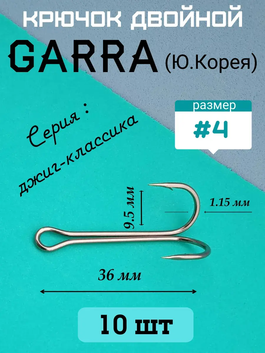 Двойной крючок джиговый удлиненный Garra размером #4. Изготовлен из высокоуглеродистой стали с антикоррозионным покрытием " темный никель ". Загиб кованый, заточка круглая. Угол разворота 80 градусов. Очень острые и прочные, при разгибании в стороны не ломаются. Основное назначение - оснащение силиконовых и поролоновых приманок. Ориентировочно двойной крючок #4 подходит для приманок длиной от 5 до 7 см. Один из самых использоваемых в джиговой ловле.