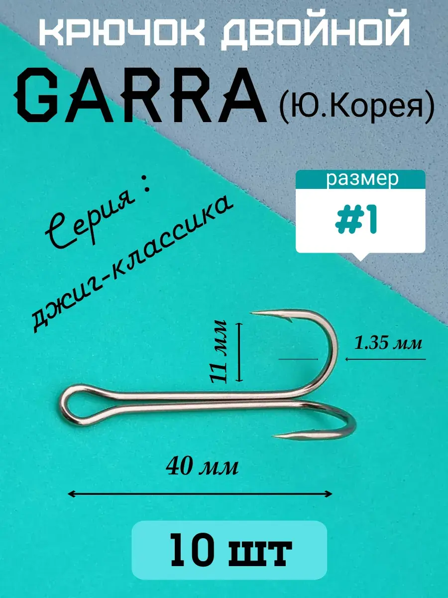 Двойной крючок джиговый удлиненный Garra размером #1. Изготовлен из высокоуглеродистой стали с антикоррозионным покрытием " темный никель ". Загиб кованый, заточка круглая. Угол разворота 80 градусов. Очень острые и прочные, при разгибании в стороны не ломаются. Основное назначение - оснащение силиконовых и поролоновых приманок. Ориентировочно двойной крючок #1 подходит для приманок длиной от 7 до 9 см. Один из самых использоваемых в джиговой ловле.