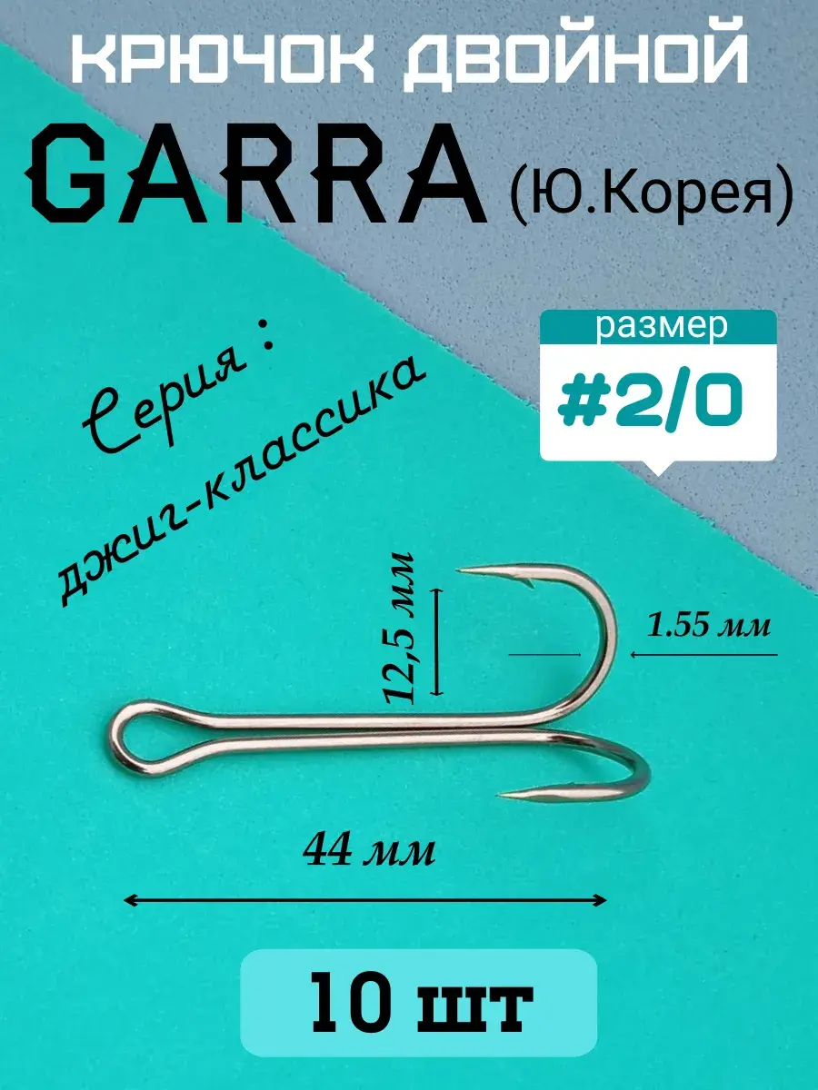 Двойной крючок джиговый удлиненный Garra размером # 2/0. Изготовлен из высокоуглеродистой стали с антикоррозионным покрытием " темный никель ". Загиб кованый, заточка круглая. Угол разворота 80 градусов. Очень острые и прочные, при разгибании в стороны не ломаются. Основное назначение - оснащение силиконовых и поролоновых приманок. Ориентировочно двойной крючок #2/0 подходит для приманок длиной от 9 до 12 см. Один из самых использоваемых в джиговой ловле.