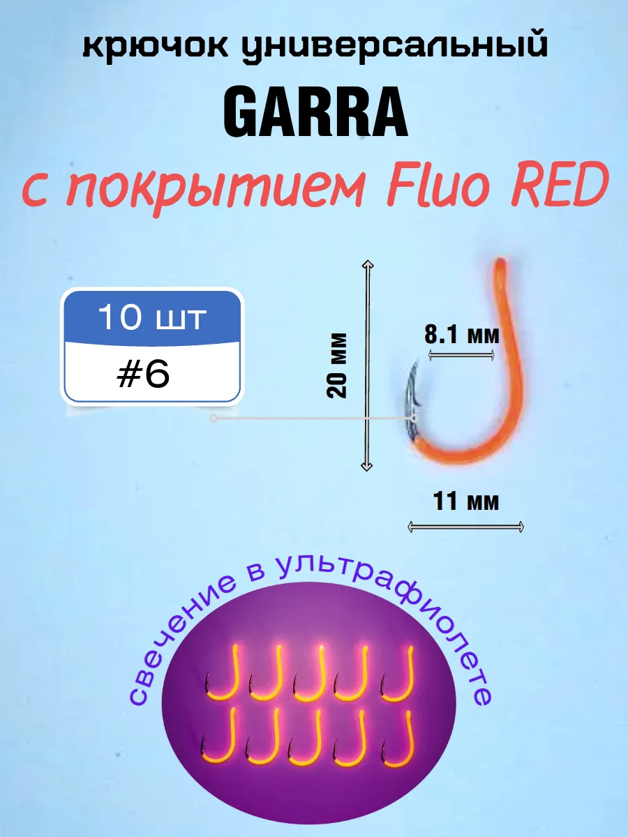 Крючrb Garra с покрытием Fluo Red предназначены для ловли разной мирной рыбы в летний и зимний периоды. Изготовлены из высокоуглеродистой стали, отличаются остротой и прочностью. Специальное покрытие дает яркое свечение в ультрафиолетовом спектре. Жало слегка загнуто внутрь и отогнуто вбок для лучшей подсечки рыбы. В качестве насадки могут использоваться различные черви, личинки, пылящие колечки.