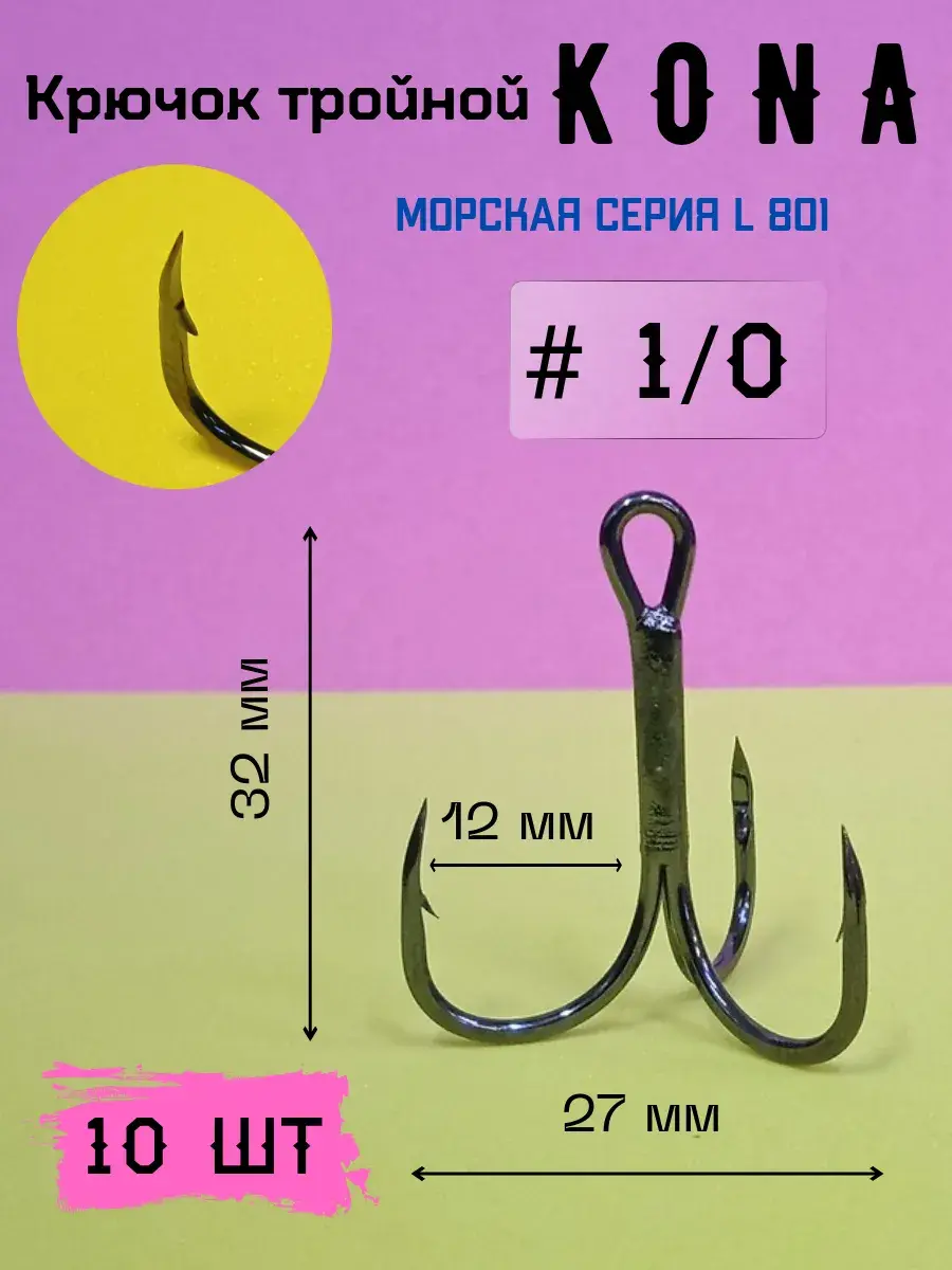 Тройной крючок с плоским загнутым жалом. Производится на китайско-японском заводе Kona. Изготовлен из высокоуглеродистой стали с повышенной антикоррозийностью, что позволяет использовать его как в пресной, так и в соленой воде. Приплюснутое жало с химической заточкой легко входит в пасть рыбы и практически исключает сходы на вываживании. Острота и прочность крючка подразумевает широкое использование в рыбной ловле. Например, оснащение твёрдых приманок ( воблеров, блесен ), мягких приманок ( силикон, мандулы ), изготовление снасточек, ловля на живца и т.д. Размерный ряд – от #6 до #1/0.