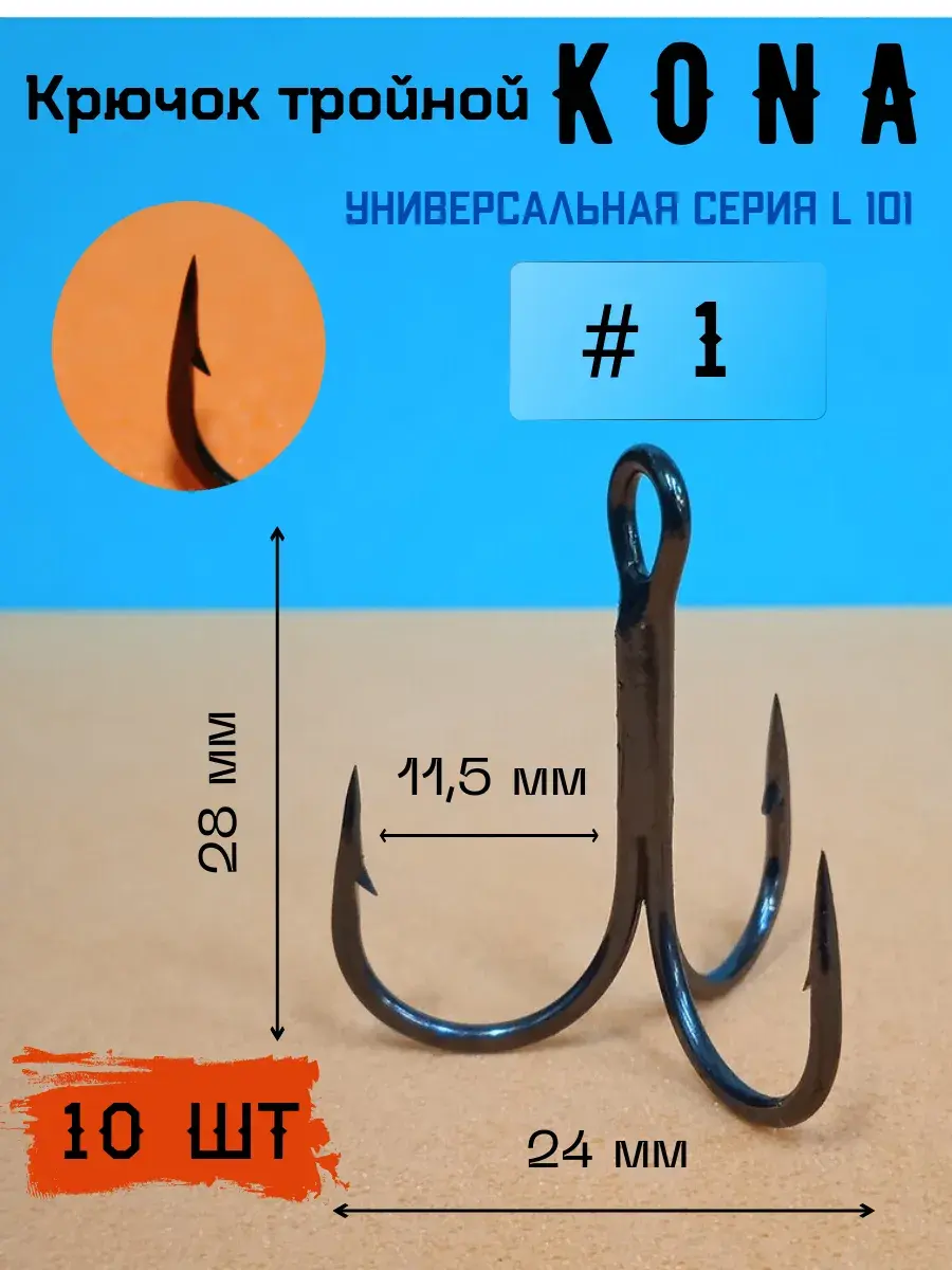 Тройной крючок с круглым загибом. Производится на китайско-японском заводе Kona.Изготовлен из высокоуглеродистой стали с повышенной антикоррозийностью, что позволяет использовать его как в пресной, так и в соленой воде. Острейшее жало с химической заточкой легко входит в пасть рыбы и практически исключает сходы на вываживании. Острота, прочность и надежность крючка подразумевает широкое использование в рыбной ловле. Например, оснащение твёрдых приманок ( воблеров, блесен ), мягких приманок ( силикон, мандулы ), изготовление снасточек, ловля на живца и т.д. Размерный ряд – от #6 до #2/0.