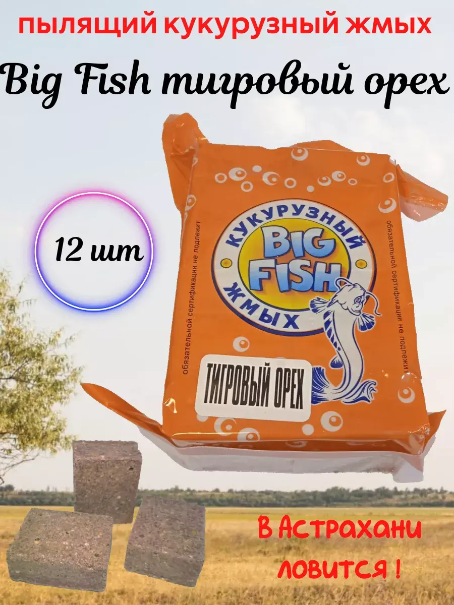 "Биг фиш" - пылящий кукурузный жмых, время растворения 1-1,5 часа. Характеризуется мелким полмолом, стойким ароматом, насыщенным цветом. Оригинальный рецепт разработан на основе кукурузы с добавлением протеина и бетаина. Также в состав входят натуральные пищевые ароматизаторы и красители, аминокислоты, витамины, рыбная и пшеничная мука, мука кукурузы с высоким содержанием протеина, Хорошо подходит для недолгих рыбалок, а также для монтажа вместе с долгим жмыхом. Кроме того может использоваться в качестве прикормки при донной ловле.