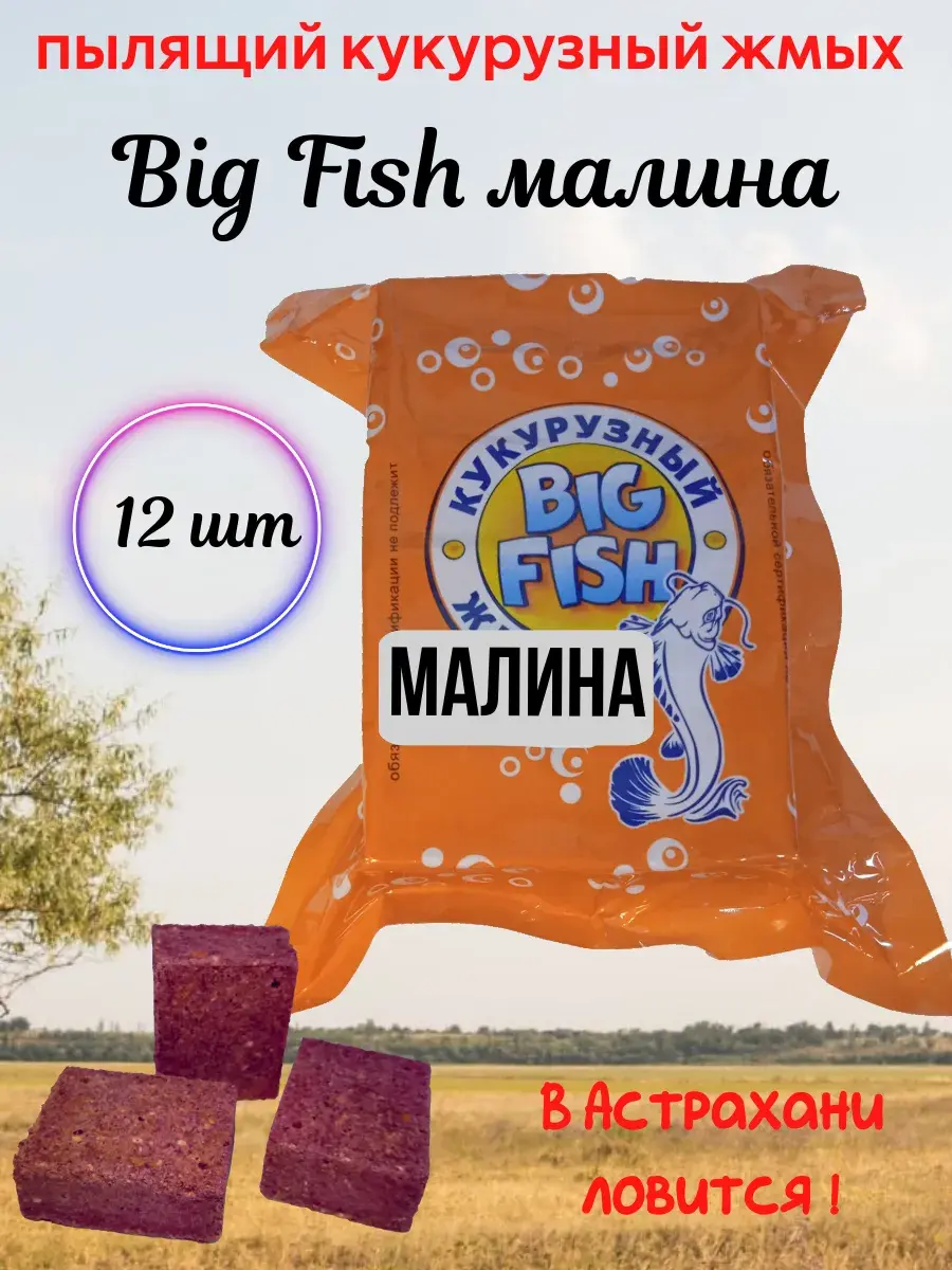 "Биг фиш" - пылящий кукурузный жмых, время растворения 1-1,5 часа. Характеризуется мелким полмолом, стойким ароматом, насыщенным цветом. Оригинальный рецепт разработан на основе кукурузы с добавлением протеина и бетаина. Также в состав входят натуральные пищевые ароматизаторы и красители, аминокислоты, витамины, рыбная и пшеничная мука, мука кукурузы с высоким содержанием протеина, Хорошо подходит для недолгих рыбалок, а также для монтажа вместе с долгим жмыхом. Кроме того может использоваться в качестве прикормки при донной ловле.