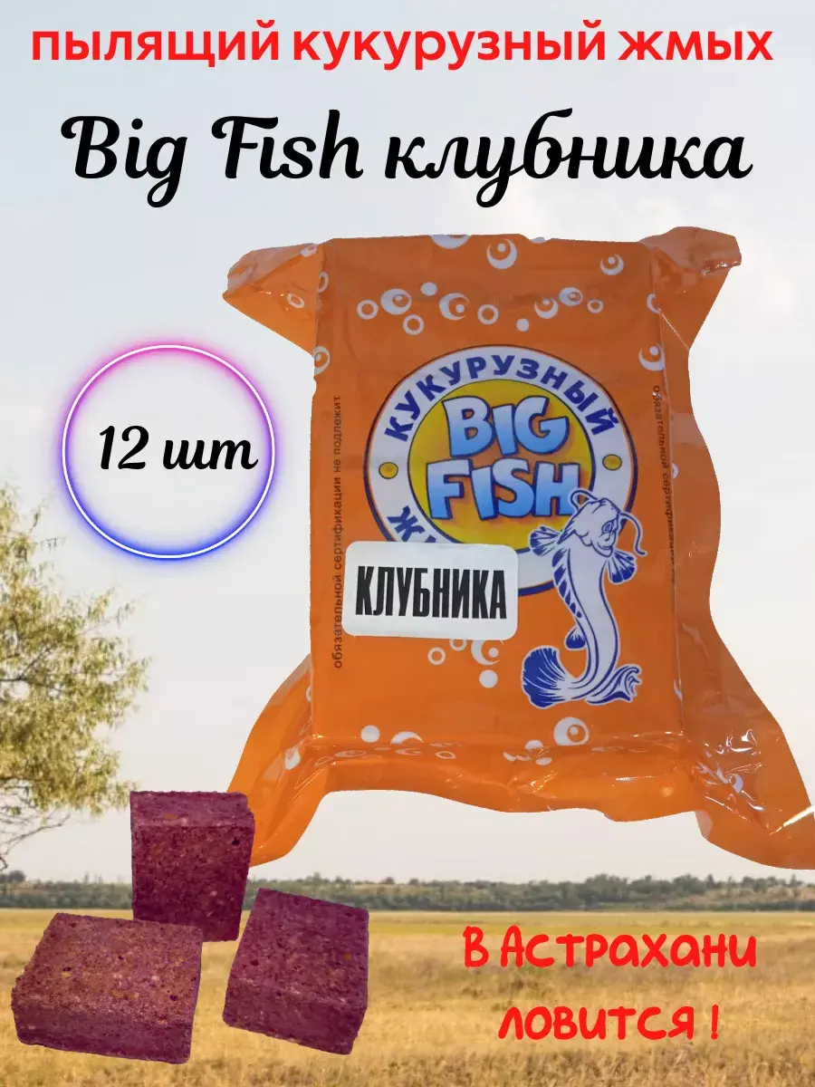 "Биг фиш" - пылящий кукурузный жмых, время растворения 1-1,5 часа. Характеризуется мелким полмолом, стойким ароматом, насыщенным цветом. Оригинальный рецепт разработан на основе кукурузы с добавлением протеина и бетаина. Также в состав входят натуральные пищевые ароматизаторы и красители, аминокислоты, витамины, рыбная и пшеничная мука, мука кукурузы с высоким содержанием протеина, Хорошо подходит для недолгих рыбалок, а также для монтажа вместе с долгим жмыхом. Кроме того может использоваться в качестве прикормки при донной ловле.