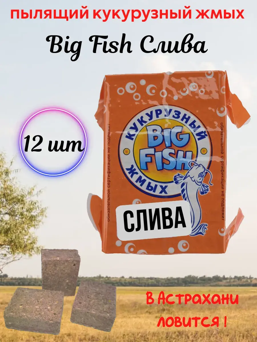 "Биг фиш" - пылящий кукурузный жмых, время растворения 1-1,5 часа. Характеризуется мелким полмолом, стойким ароматом, насыщенным цветом. Оригинальный рецепт разработан на основе кукурузы с добавлением протеина и бетаина. Также в состав входят натуральные пищевые ароматизаторы и красители, аминокислоты, витамины, рыбная и пшеничная мука, мука кукурузы с высоким содержанием протеина, Хорошо подходит для недолгих рыбалок, а также для монтажа вместе с долгим жмыхом. Кроме того может использоваться в качестве прикормки при донной ловле. Именно жмых с ароматом чеснока идеально подходит для ловли сазана по холодной воде.