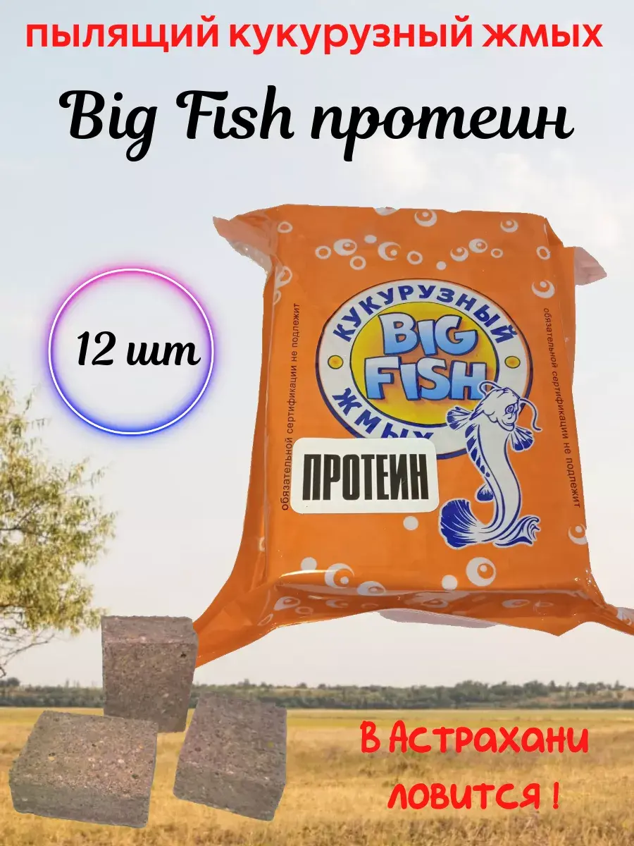 "Биг фиш" - пылящий кукурузный жмых, время растворения 1-1,5 часа. Характеризуется мелким полмолом, стойким ароматом, насыщенным цветом. Оригинальный рецепт разработан на основе кукурузы с добавлением протеина и бетаина. Также в состав входят натуральные пищевые ароматизаторы и красители, аминокислоты, витамины, рыбная и пшеничная мука, мука кукурузы с высоким содержанием протеина, Хорошо подходит для недолгих рыбалок, а также для монтажа вместе с долгим жмыхом. Кроме того может использоваться в качестве прикормки при донной ловле.