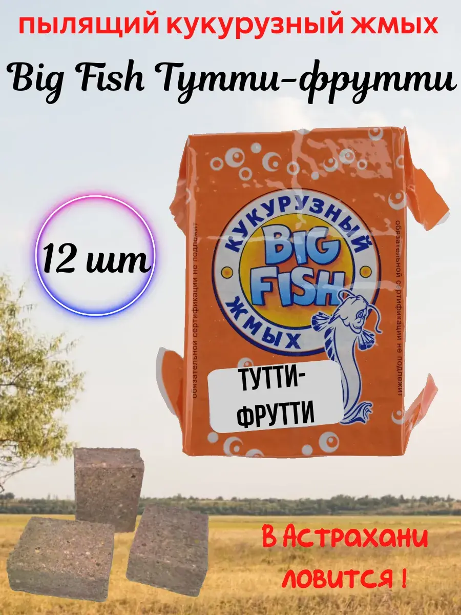 "Биг фиш" - пылящий кукурузный жмых, время растворения 1-1,5 часа. Характеризуется мелким полмолом, стойким ароматом, насыщенным цветом. Оригинальный рецепт разработан на основе кукурузы с добавлением протеина и бетаина. Также в состав входят натуральные пищевые ароматизаторы и красители, аминокислоты, витамины, рыбная и пшеничная мука, мука кукурузы с высоким содержанием протеина, Хорошо подходит для недолгих рыбалок, а также для монтажа вместе с долгим жмыхом. Кроме того может использоваться в качестве прикормки при донной ловле. Именно жмых с ароматом чеснока идеально подходит для ловли сазана по холодной воде.