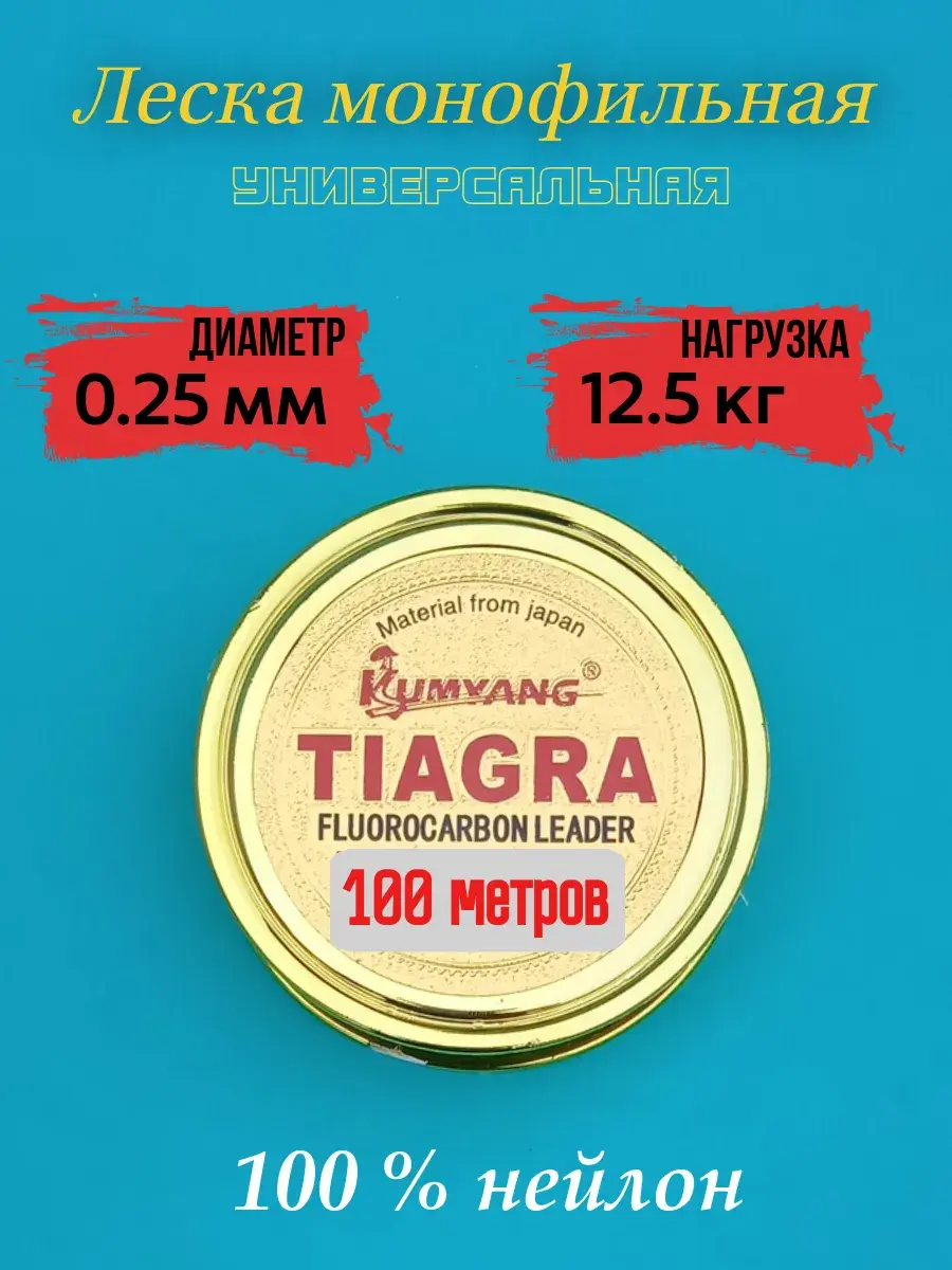 "Tiagra" - монофильная леска универсального назначения. Состав - 100 % нейлон. Отличается гладкой поверхностью по всей длине. Хорошо держите узел, не ломается. Растяжимость 25-30 %, хорошо амортизиркет рывки крупной рыбы. благодаря гладкой и рорвной поверхности практически не обмерзает зимой. Подходит для всех видов рыбной ловли.