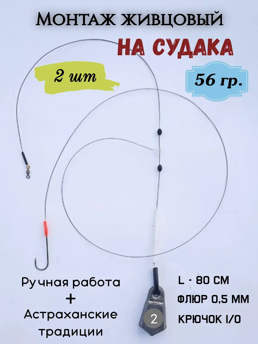 Монтаж предназначен для ловли судака на малька/живца взаброс. Основная леска длиной 50 см изготовлена из монофильной лески диаметром 0.8 мм, поводок - из флюорокарбона диаметром 0.5 мм. Поводок крепится к основной лески с помощью специального пластикового отвода, который предотвращает перекручивание лески. Силиконовые стопора позволяют зафиксировать поводок на любой высоте. Неснимаемое грузило крепится на эластичной пластиковой трубочке для предотвращения перетирания основной лески.
