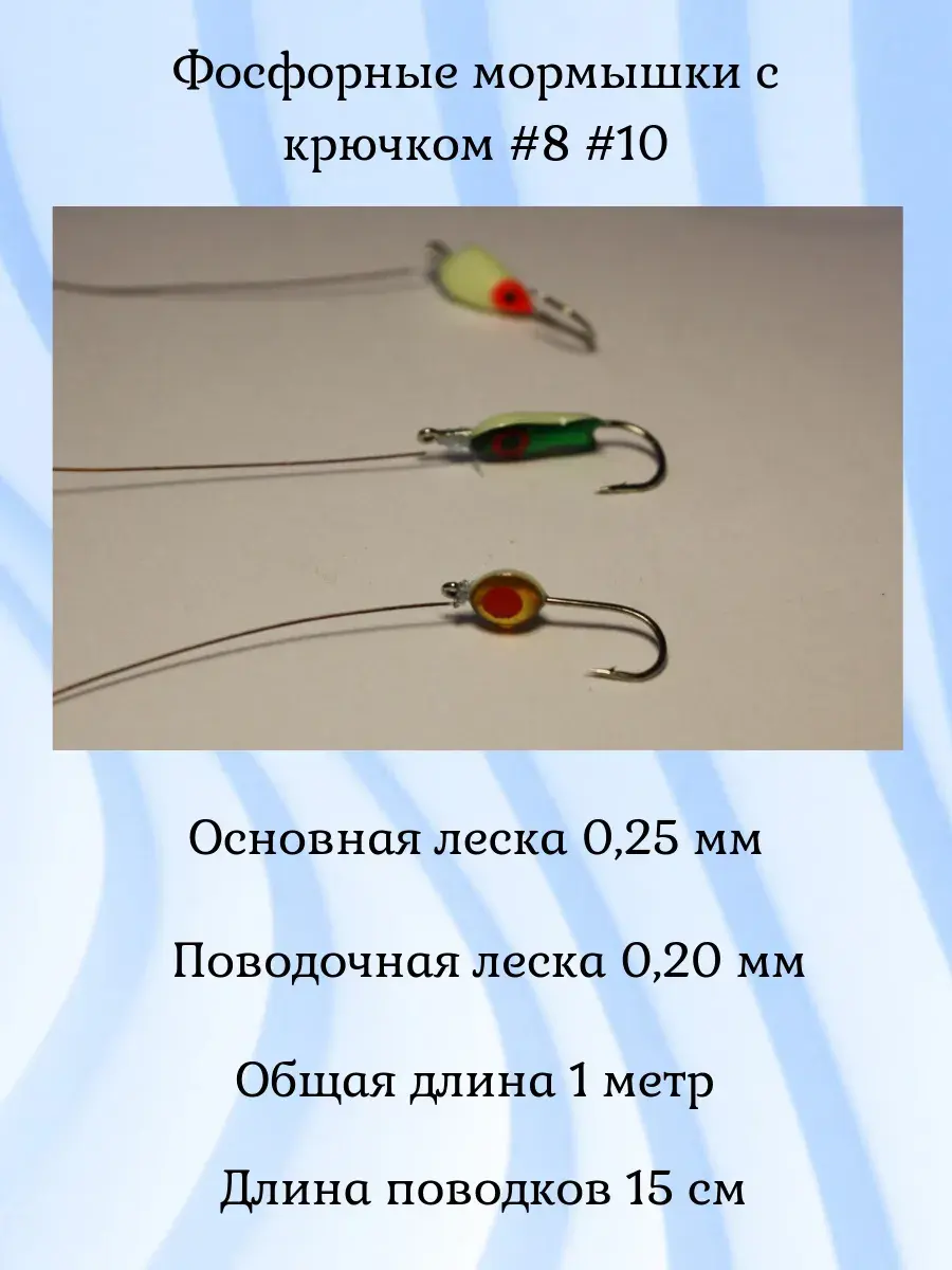 "Зимняя елочка" - готовый монтаж для ловли мирной рыбы в основном со льда. Главная особенность - вместо крючков смонтированы фосфорные пластиковые мормышки. Диаметр основы - 0,25 мм, поводков - 0,2 мм.В верхней части монтажа стоит заводное колечко для удобства крепления к основной леске. Снизу находится петля под грузило или кормушку. Мормышки оснащены качественными крючками размером #8 и #10. Набор включает 3 готовых монтажа с тремя мормышками на каждом. Также монтаж вполне можно использовать и летом. Предназначен для ловли воблы, густеры, сопы, чехони, подлещика, плотвы и других мирных рыб. Монтаж намотан на полистирольное мотовило для предотвращения запутывания. Грузило в комплект не входит.
