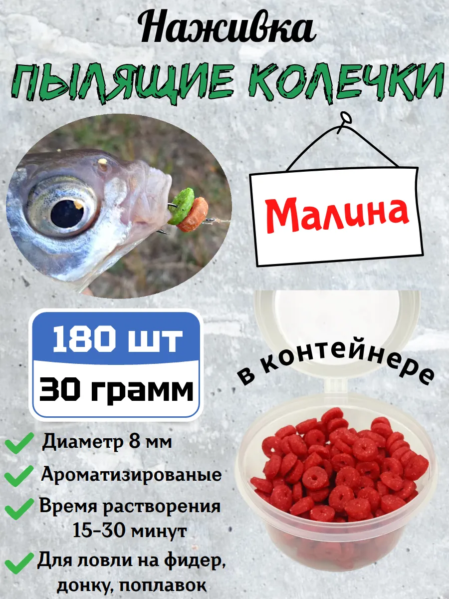 ароматизаторов и красителей. Характерной особенностью является сильный и стойкий запах. При попадании в воду колечки начинаю пылить и активно привлекать рыбу за счёт запаха, вкуса и цвета. Время растворения 15-30 минут, в зависимости от условий ловли. Колечки насаживаются непосредственно на крючок, что очень удобно, в количестве нескольких штук. Довольно часто отличный результат приносит комбинация из нескольких колечек разного вкуса и цвета. Также колечки можно комбинировать с животными насадками, такими как опарыш, червь и т д. Большим преимуществом этой насадки является то, что мелкая рыбка не может ее заглотить и лишь теребит её, не доводя дело до поклёвки. Рыба среднего и крупного размеров обычно берёт жадно и взаглот.
