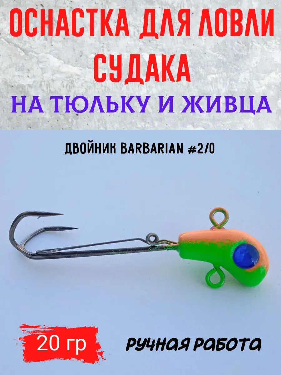 Оснастка для ловли судака на тюльку или живца. Оригинальная конструкция отлично держит приманку и не дает ей спадать на проводке. Оснащена мощным и острым двойным крючком с загибом BARBARIAN, размером 2/0. Порошково-полимерное покрытие очень долговечно, прекрасно держит поклевки зубастых хищных рыб, а также светится в ультрафиолете.