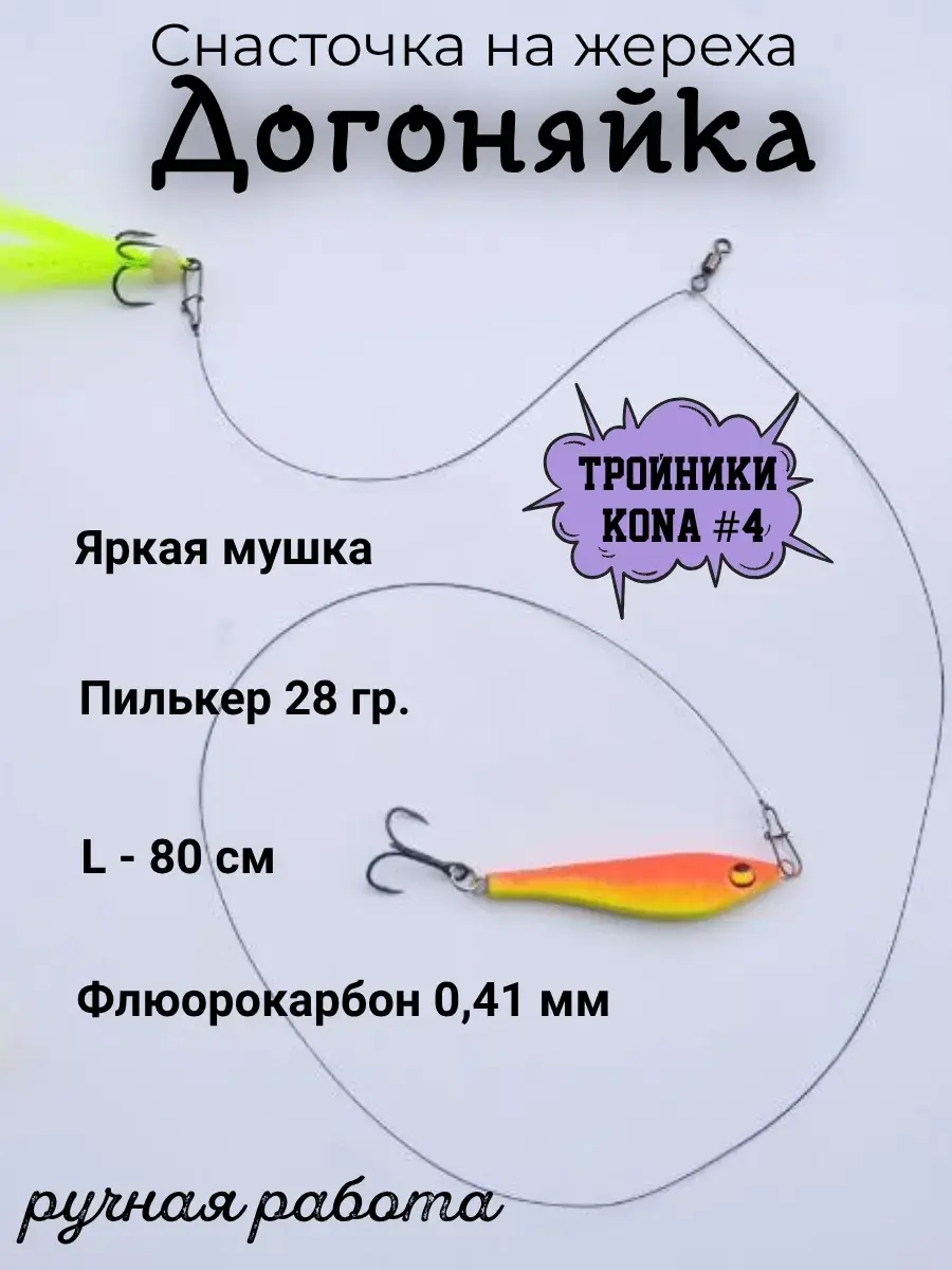 Снасточка " Догоняйка " - универсальный монтаж для ловли хищной рыбы, в первую очередь жереха. Сам монтаж изготовлен из флюорокарбона диаметром 0.41 мм. Короткий поводок предназначен для монтажа тройника с оперением или же любой лёгкой приманки. На длинном, примерно 80 см, поводке цепляется пилькер весом 28 грамм. Конструкция позволяет делать дальние забросы в расчете на осторожного жереха. Проводка равномерная, в толще воды. В большинстве случаем жерех атакует именно тройник с опушкой. Поводки оснащены карабинами-"американками", что позволяет легко менять приманки на любые другие. Например, вместо пилькера можно поставить блесну " Кастмастер ", тейл-спиннер, тяжелую вертушку. Монтаж на жереха, снасточка на жереха, готовая снасть на жереха, жереховый монтаж, приманка для ловли жереха.