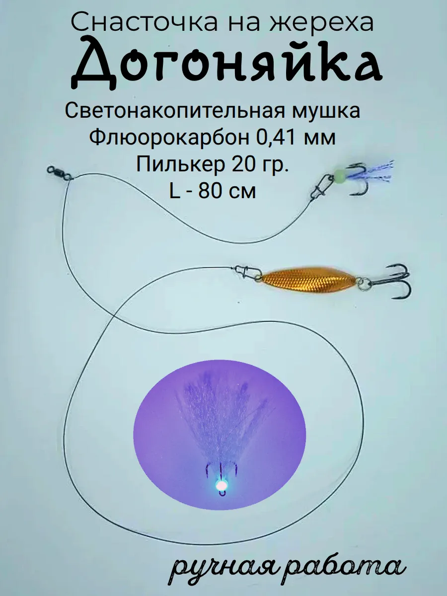 Снасточка " Догоняйка " - универсальный монтаж для ловли хищной рыбы, в первую очередь жереха. Сам монтаж изготовлен из флюорокарбона диаметром 0.41 мм. Короткий поводок предназначен для монтажа тройника с оперением или же любой лёгкой приманки. На длинном, примерно 80 см, поводке цепляется пилькер весом 20 грамм. Конструкция позволяет делать дальние забросы в расчете на осторожного жереха. Проводка равномерная, в толще воды. В большинстве случаем жерех атакует именно тройник с опушкой. Поводки оснащены карабинами-"американками", что позволяет легко менять приманки на любые другие. Например, вместо пилькера можно поставить блесну " Кастмастер ", тейл-спиннер, тяжелую вертушку. Монтаж на жереха, снасточка на жереха, готовая снасть на жереха, жереховый монтаж, приманка для ловли жереха.