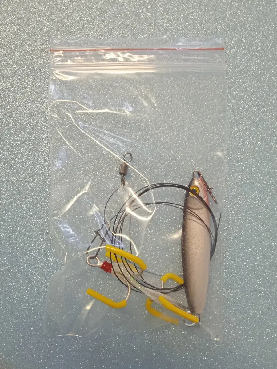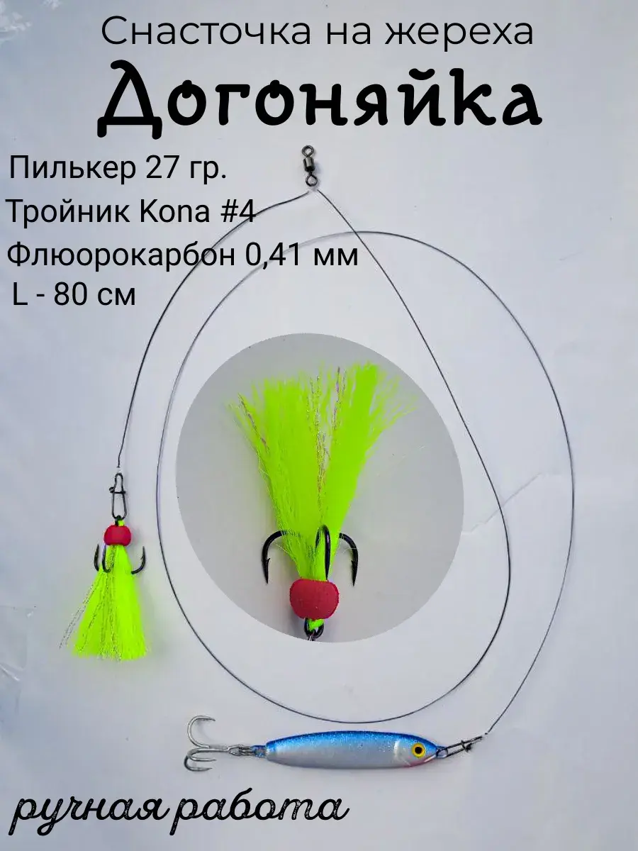 Снасточка " Догоняйка " - универсальный монтаж для ловли хищной рыбы, в первую очередь жереха. Сам монтаж изготовлен из флюорокарбона диаметром 0.41 мм. Короткий поводок предназначен для монтажа тройника с оперением или же любой лёгкой приманки. На длинном, примерно 80 см, поводке цепляется пилькер весом 27 грамм. Конструкция позволяет делать дальние забросы в расчете на осторожного жереха. Проводка равномерная, в толще воды. В большинстве случаем жерех атакует именно тройник с опушкой. Поводки оснащены карабинами-"американками", что позволяет легко менять приманки на любые другие. Например, вместо пилькера можно поставить блесну " Кастмастер ", тейл-спиннер, тяжелую вертушку. Монтаж на жереха, снасточка на жереха, готовая снасть на жереха, жереховый монтаж, приманка для ловли жереха.