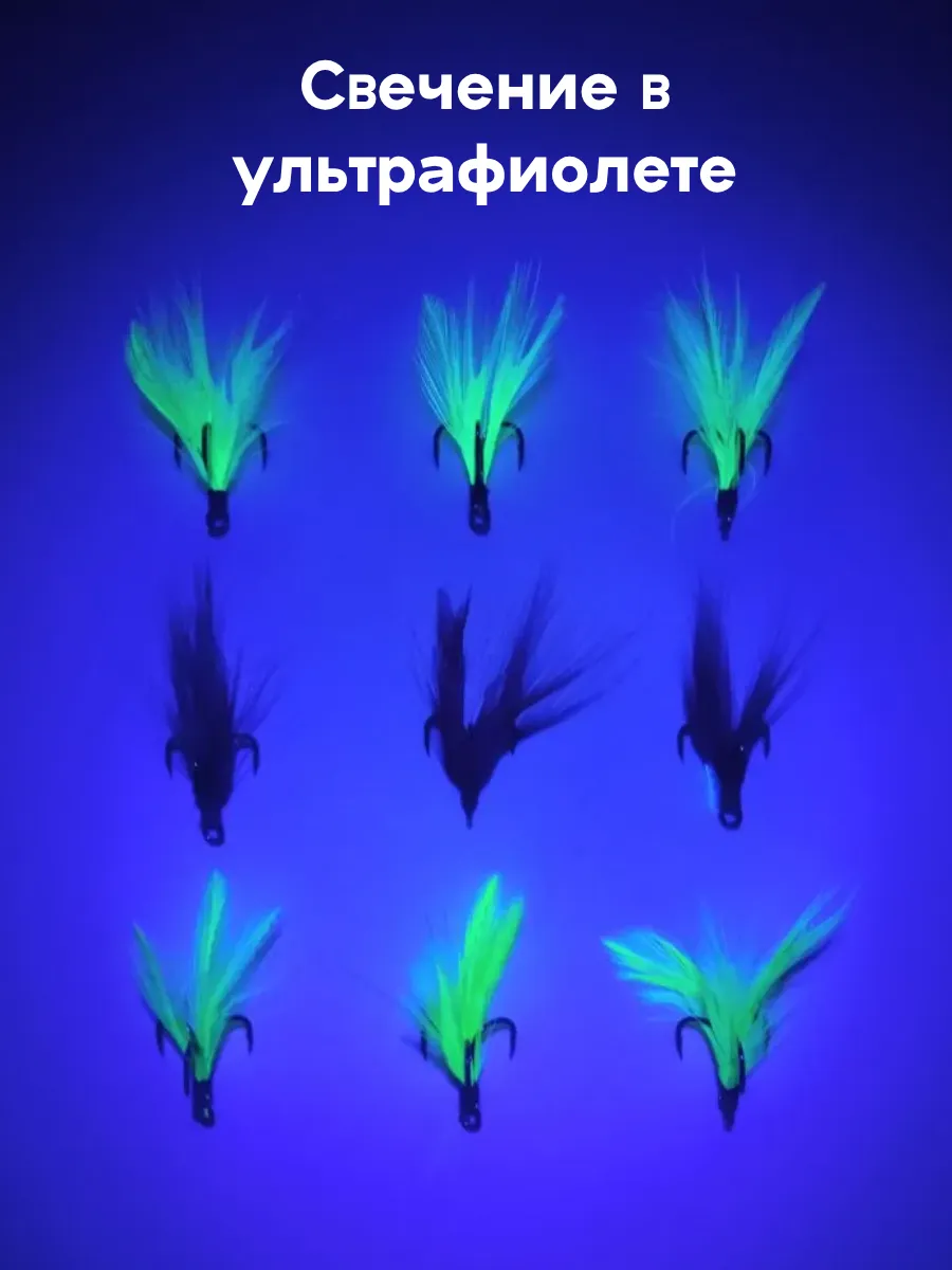 Набор состоит из девяти тройных крючков размером #6 с цветной опушкой . Оперение изготовлено из натурального пера с добавлением люрекса и жестко фиксируется на цевье красной нитью.