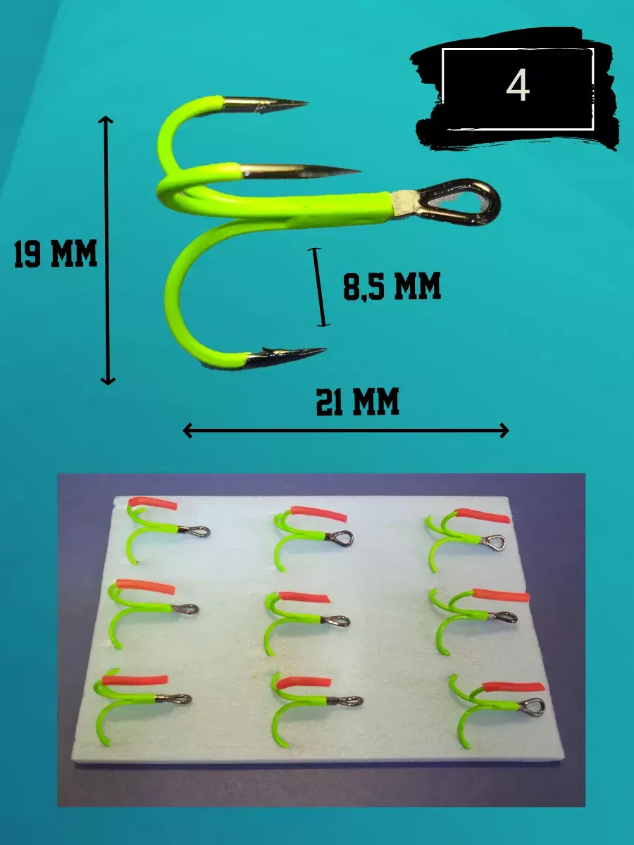 Тройной крючок ST-36 изготовлен из высокоуглеродистой стали на заводе Kona ( Китай ). Отличается высокой прочностью, остротой, обусловленной химической заточкой, а также покрытием fluo chartreuse. Покрытие ярко светится в ультрафиолетовом спектре, что дополнительно привлекает рыбу.