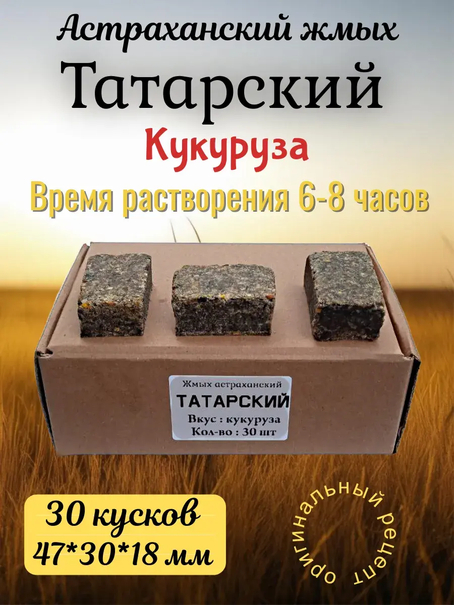 Жмых " Татарский" изготовляется в Астрахани опытным мастером по оригинальному рецепту более 20 лет. В состав входят - семечка подсолнечника, кукуруза, рис, манка, перловка и другие компоненты. Время растворения на среднем течении примерно 6-8 часов. Причем жмых в процессе размывания совершенно не теряет аромат. Идеально подходит для ночной ловли. Распространенной практикой является метод " бутерброда ", когда к " Татарскому" жмых добавляется ещё кусочек быстропылящего, например " Золотого ", жмыха. Пылящий жмых начинает растворяться и привлекать рыбу сразу и к моменту подхода её к приманке начинает работать долгоиграющий жмых .