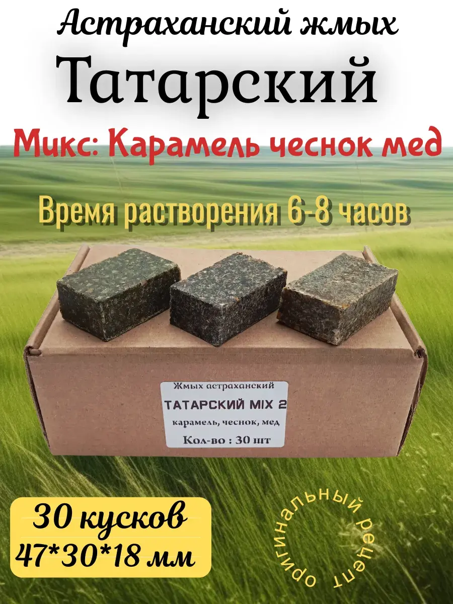 Жмых " Татарский" изготовляется в Астрахани опытным мастером по оригинальному рецепту более 20 лет. В состав входят - семечка подсолнечника, кукуруза, рис, манка, перловка и другие компоненты. Время растворения на среднем течении примерно 6-8 часов. Причем жмых в процессе размывания совершенно не теряет аромат. Идеально подходит для ночной ловли. Распространенной практикой является метод " бутерброда ", когда к " Татарскому" жмых добавляется ещё кусочек быстропылящего, например " Золотого ", жмыха. Пылящий жмых начинает растворяться и привлекать рыбу сразу и к моменту подхода её к приманке начинает работать долгоиграющий жмых .