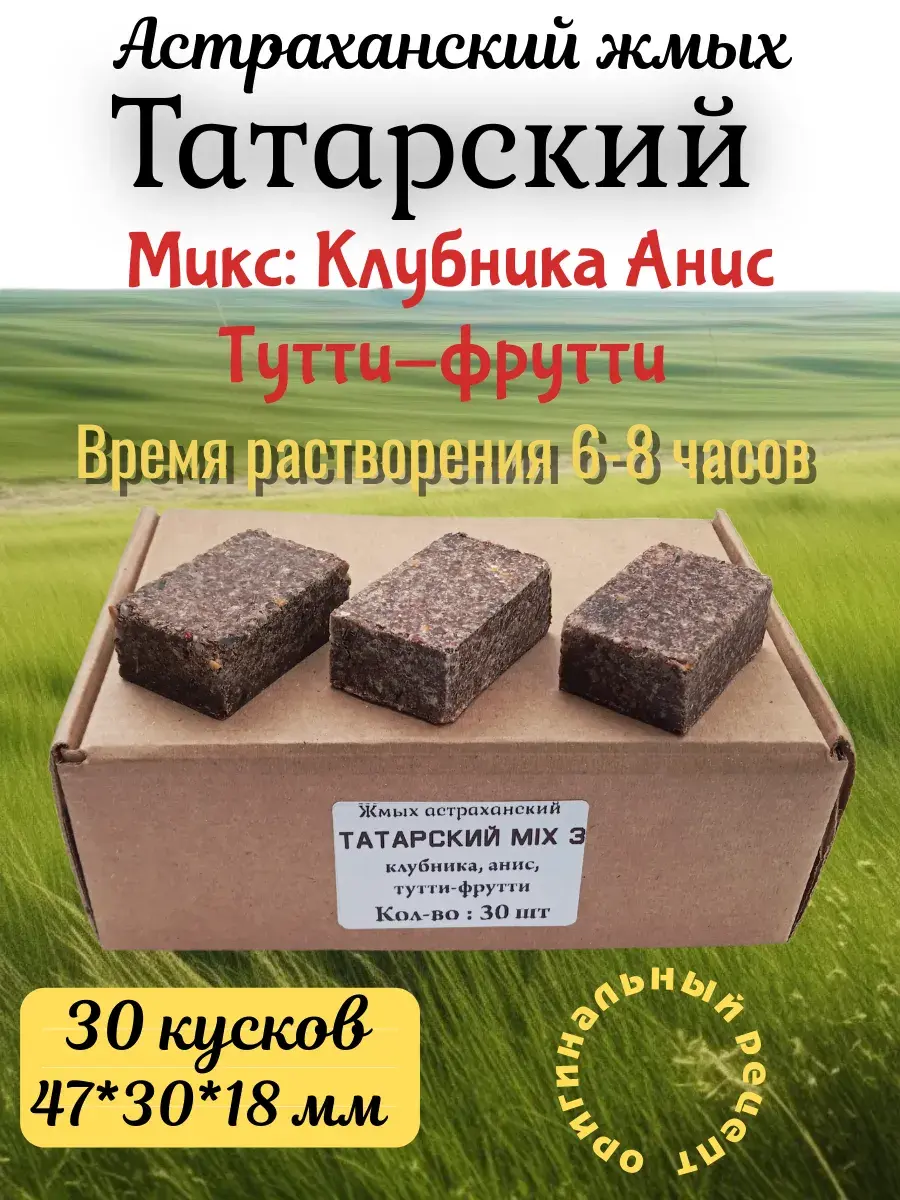 Жмых " Татарский" изготовляется в Астрахани опытным мастером по оригинальному рецепту более 20 лет. В состав входят - семечка подсолнечника, кукуруза, рис, манка, перловка и другие компоненты. Время растворения на среднем течении примерно 6-8 часов. Причем жмых в процессе размывания совершенно не теряет аромат. Идеально подходит для ночной ловли. Распространенной практикой является метод " бутерброда ", когда к " Татарскому" жмых добавляется ещё кусочек быстропылящего, например " Золотого ", жмыха. Пылящий жмых начинает растворяться и привлекать рыбу сразу и к моменту подхода её к приманке начинает работать долгоиграющий жмых .
