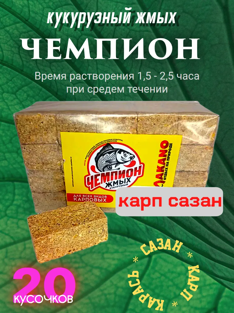 Жмых "Чемпион" - пылящий жмых с насыщенным вкусом, предназначен для ловли сазана, карпа, карася и других мирных рыб. Сбалансированный состав на основе кукурузы и оригинальный процесс производства позволяет успешно ловить сазана в любых условиях. После попадания в воду жмых начинает пылить в течении пяти минут, создавая мучинистое облако. На среднем течении время растворения примерно 1,5 - 2,5 часа. При ловле в водоемах без течения жмых стоит подольше, до 3,5 часов. На сильном течении, на таких реках как Волга, Бузан, Кизань время растворения примерно час.