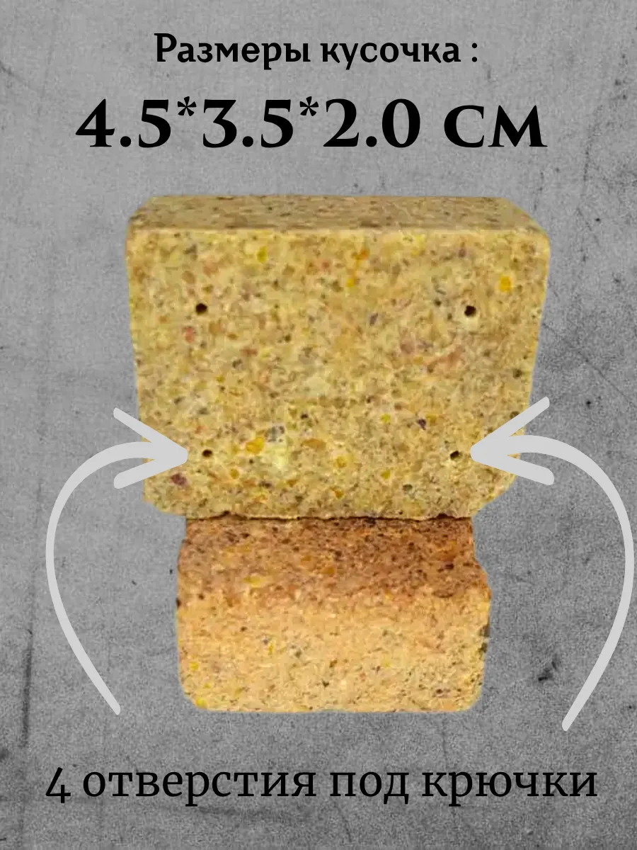В брикете 20 кусочков жмыха размером 4,5*3,5*2 см. Брикет упакован в воздушно-пузырчатую пленку. Срок годности 24 месяца.