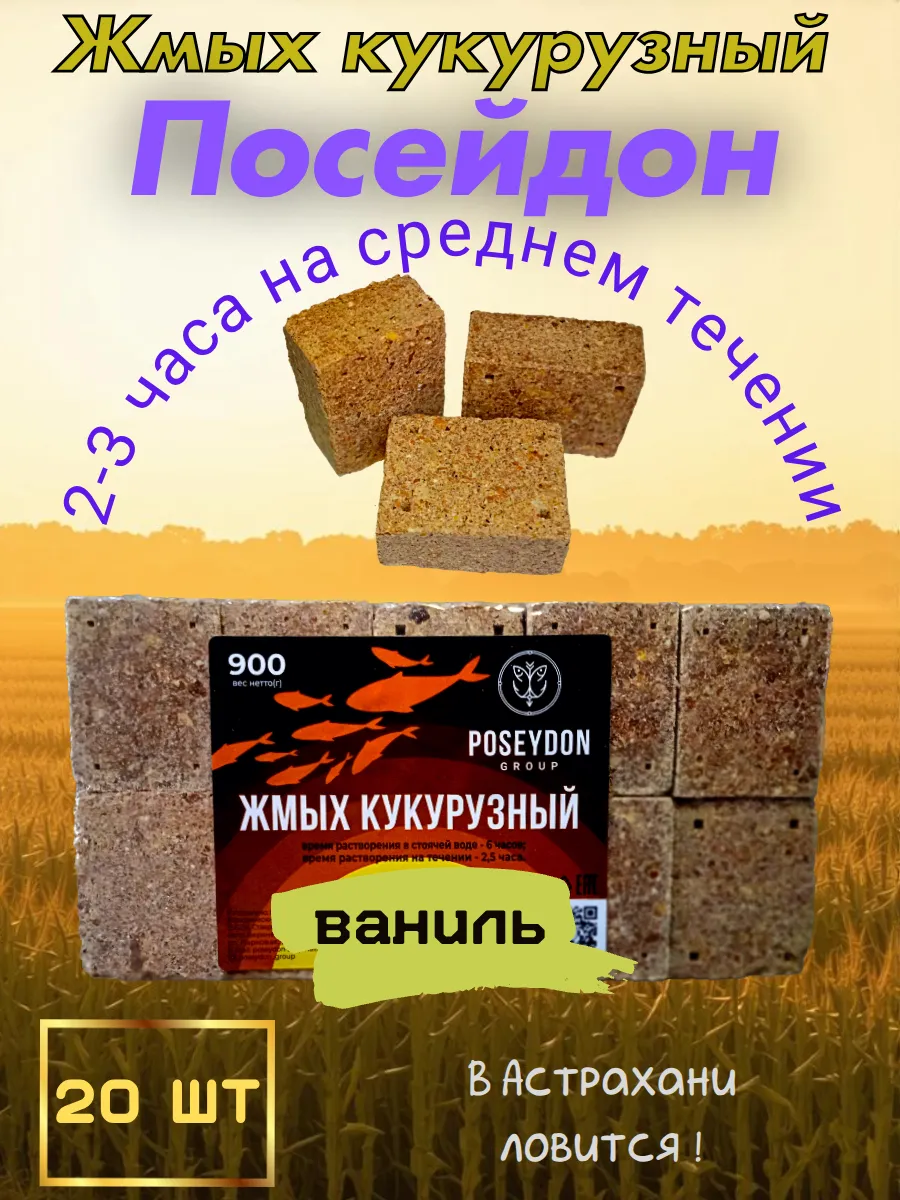 Кукурузный жмых " Посейдон " производится из натуральной кукурузы методом горячего отжима с добавлением натуральных атрактантов. Время растворения на среднем течении составляет 2-3 часа. Предназначен для ловли сазана как в диких условиях, так и в прудовых хозяйствах. Обладает умеренным ароматом, идеален для ловли в прохладной воде. Имеет отверстия под крючки.
